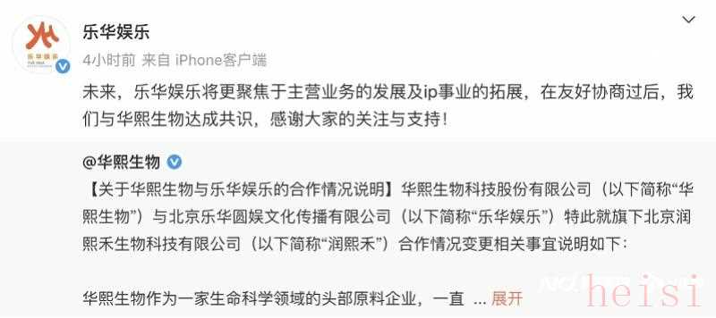 樂華娛樂在微博轉發(fā)了華熙生物的聲明,并表示未來樂華娛樂將更聚焦于主營業(yè)務的發(fā)展及IP事業(yè)的拓展,在友好協(xié)商過后,他們與華熙生物達成共識。