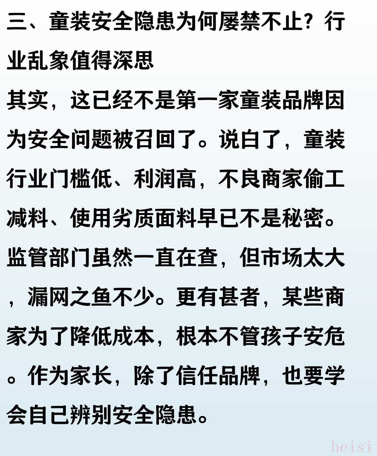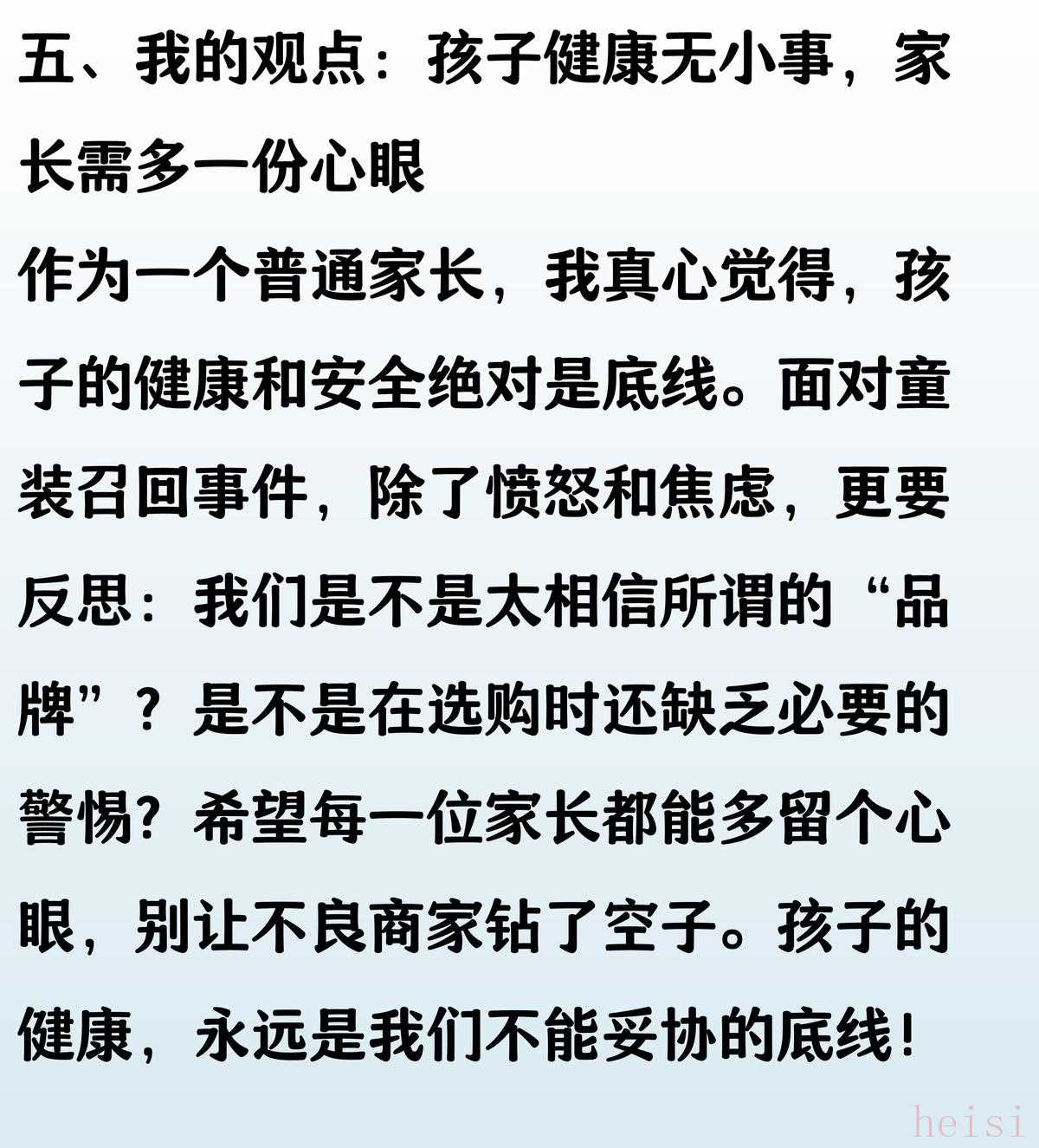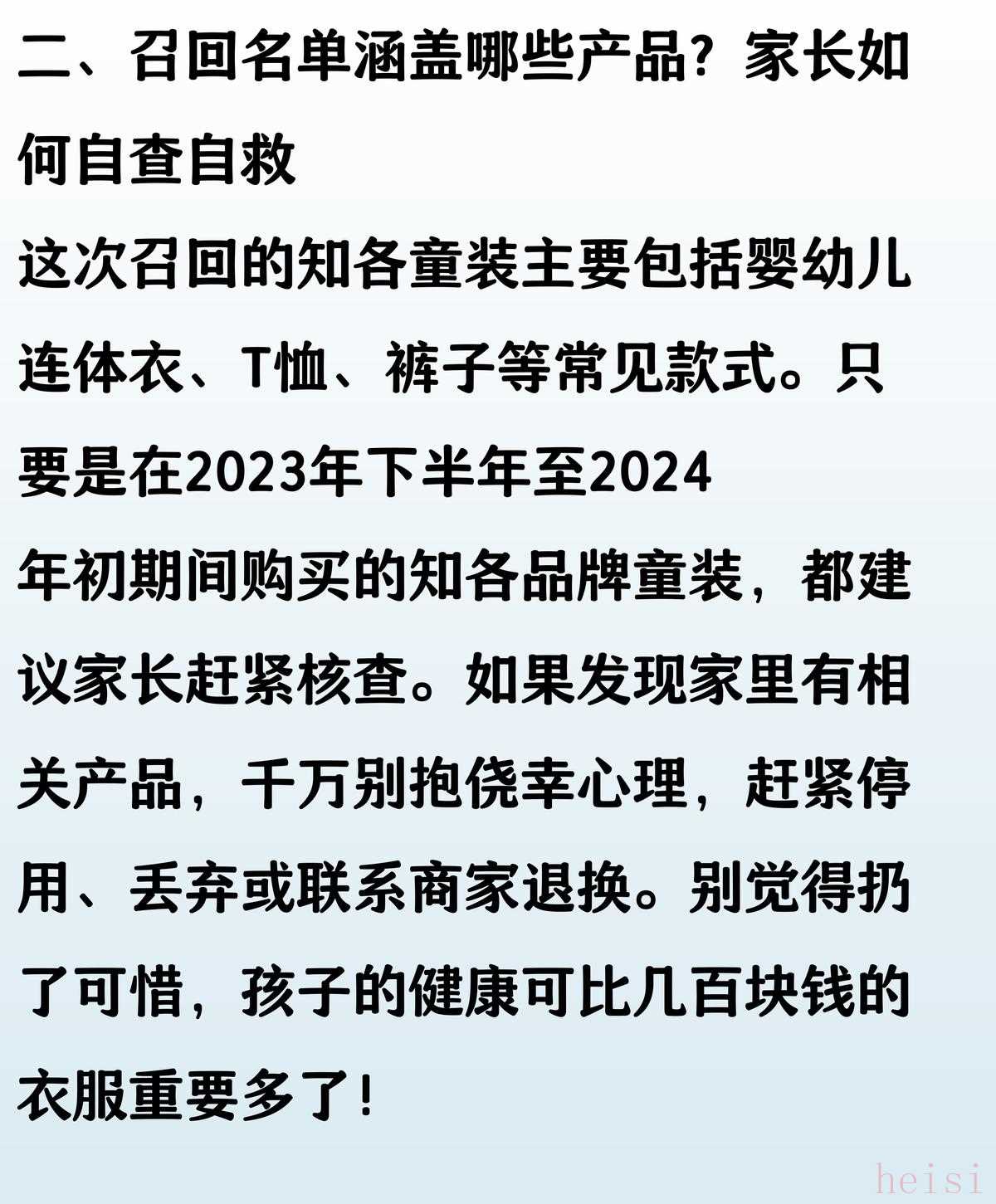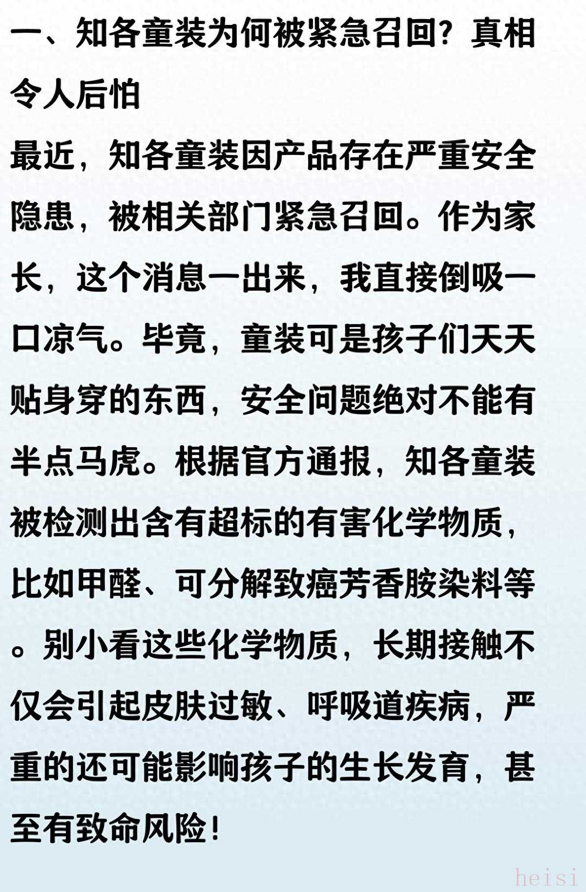 首先感謝小伙伴的閱讀,歡迎大家進(jìn)行點(diǎn)贊、關(guān)注、收藏。小編在此也祝大家日進(jìn)斗金、財(cái)源滾滾。說(shuō)實(shí)話,看到知各童裝被緊急召回的消息,真的嚇了一跳。家里有小孩的家長(zhǎng)們可得長(zhǎng)點(diǎn)心,這可不是小事,嚴(yán)重的甚至?xí){孩子生命。 孩子的安全大于天,衣服質(zhì)量不過(guò)關(guān)堅(jiān)決不能留。別心疼那點(diǎn)錢(qián),趕緊清理掉,孩子健康最重要!