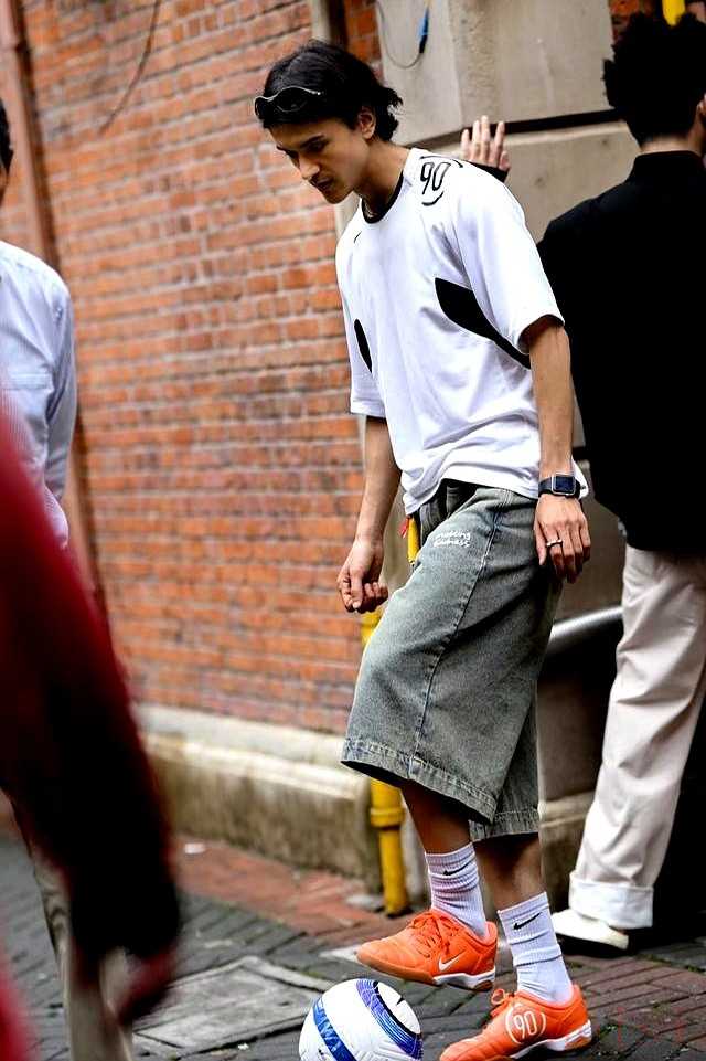 有人用足球鞋搭配足球服和復(fù)古元素,比如牛仔中褲,強(qiáng)化足球風(fēng)格。