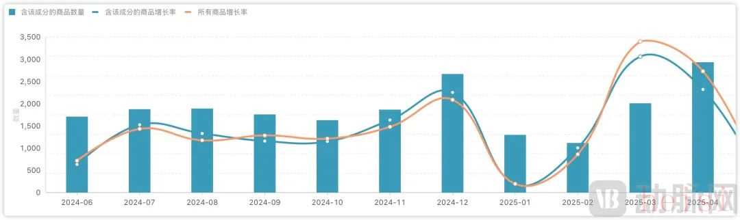 過去幾年,“煙酰胺精華”、“玻尿酸面霜”等以特定成分命名的產(chǎn)品名稱已成為護(hù)膚品牌命名的普遍現(xiàn)象。不使用此類專有成分名稱,似乎難以體現(xiàn)品牌在護(hù)膚領(lǐng)域的專業(yè)性。根據(jù)美麗修行大數(shù)據(jù)平臺(tái)截至2025年5月的統(tǒng)計(jì)數(shù)據(jù)顯示,名稱中包含"煙酰胺"的產(chǎn)品數(shù)量已達(dá)1.6萬件,含有"玻色因"的產(chǎn)品數(shù)量也接近1.6萬件,而名稱中包含"膠原"的產(chǎn)品數(shù)量則超過1.39萬件。值得注意的是,在過去幾年中,這三種成分幾乎占據(jù)了此類命名方式的絕大部分市場份額。