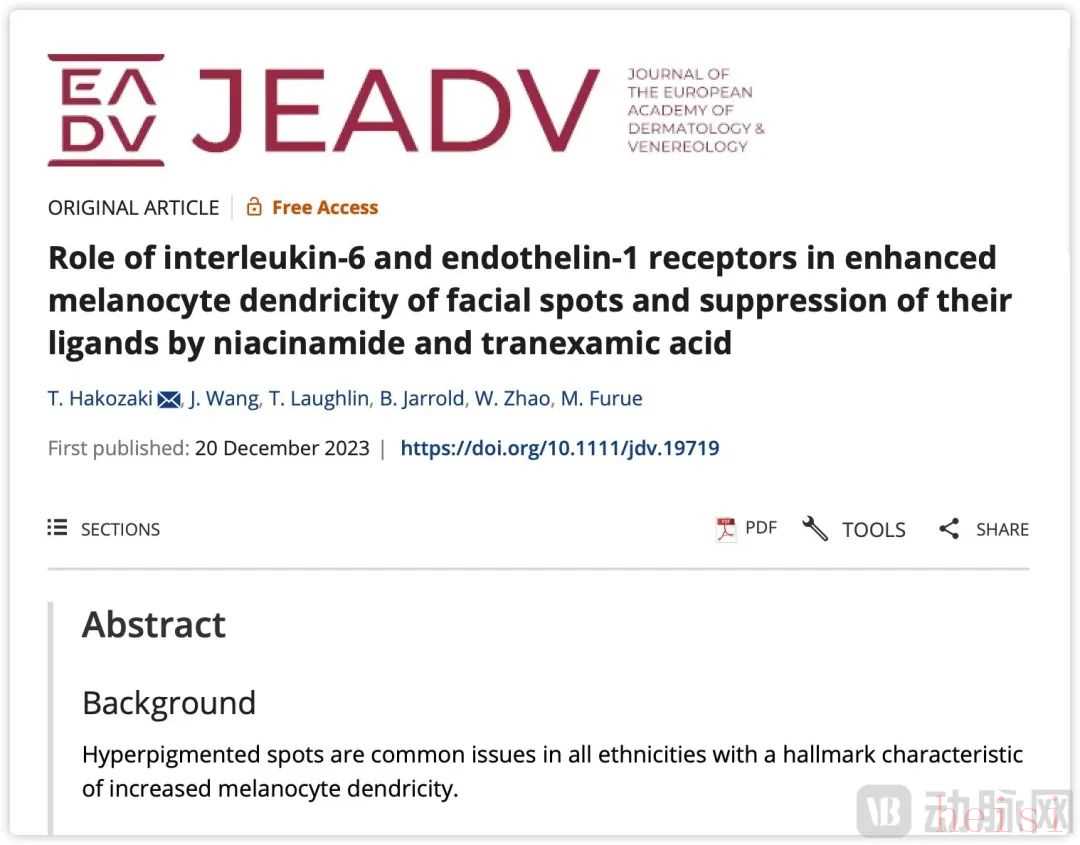 2023年,寶潔在JEADV(《歐洲皮膚性病學(xué)雜志》)上發(fā)表了題為《IL-6和ET-1的受體在面部色斑黑素細(xì)胞樹突增多中的作用以及煙酰胺和傳明酸對其的抑制作用》的論文,宣布其對傳明酸在美白方面的研究取得新進(jìn)展。