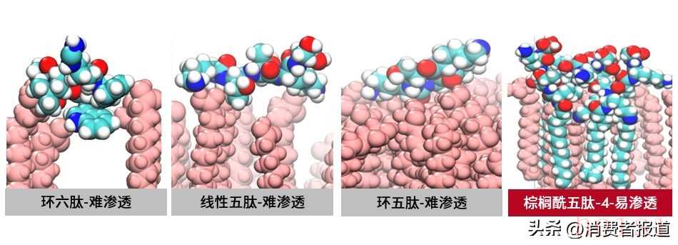 ▲通過(guò)超級(jí)計(jì)算機(jī)模擬實(shí)證,棕櫚酰五肽-4能夠有效與皮膚結(jié)合,更快帶動(dòng)勝肽分子的滲透(圖中粉色部分代表皮膚結(jié)構(gòu))