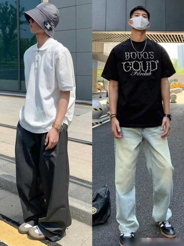 2. "風(fēng)格感強(qiáng)":這種搭配通常能營(yíng)造出一種休閑、街頭或者略帶酷感的風(fēng)格。闊腿褲可以很好地修飾腿型,搭配合身的上衣和德訓(xùn)鞋,可以打造出層次感。