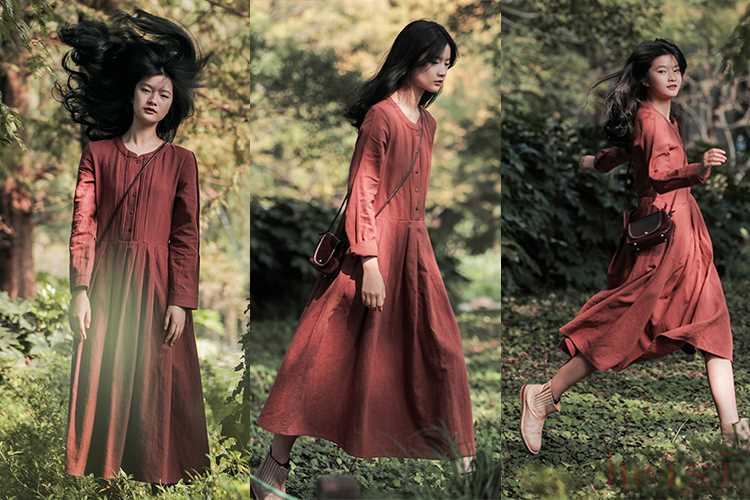 1. "自然肌理之美 (Natural Texture):" 棉麻面料最大的特點就是其天然的肌理感。棉的柔軟、麻的粗糙,共同構(gòu)成了連衣裙表面獨特的紋理。這種紋理不光滑,卻充滿生命力,仿佛帶著大地的氣息,給人一種質(zhì)樸、原始而又高級的感覺。它不像絲綢般華麗,也不像化纖般單調(diào),這種自然的質(zhì)感本身就極具魅力。