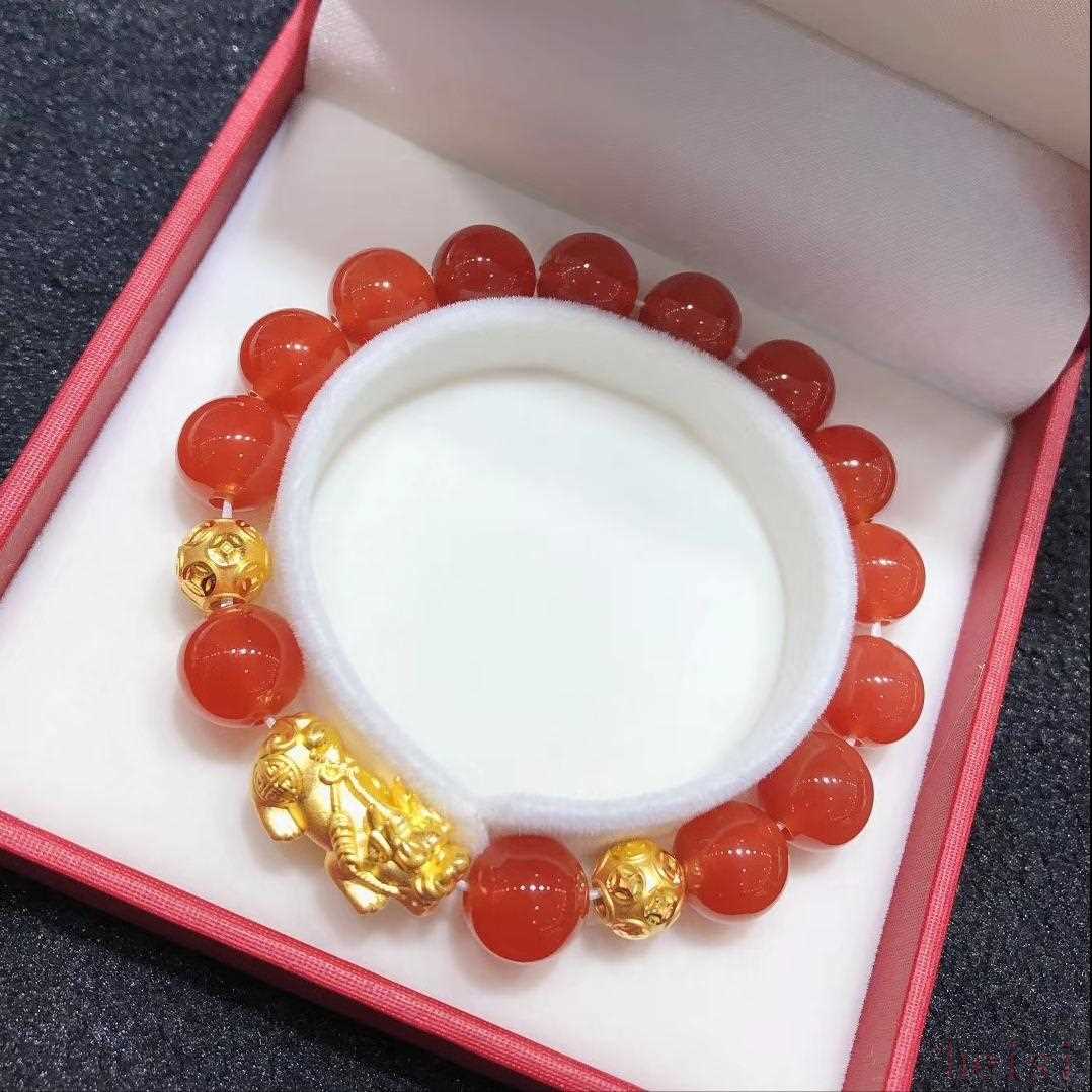 紅繩手串:對于我們中國人過年來說,黃金就是一個不可或缺的珠寶首飾。用紅繩編織的黃金手串送人或自己帶都是非常不錯的選擇??钍缴弦话闶且约t瑪瑙配貔貅,招財又喜慶。紅繩編黃金生肖轉(zhuǎn)運珠。
