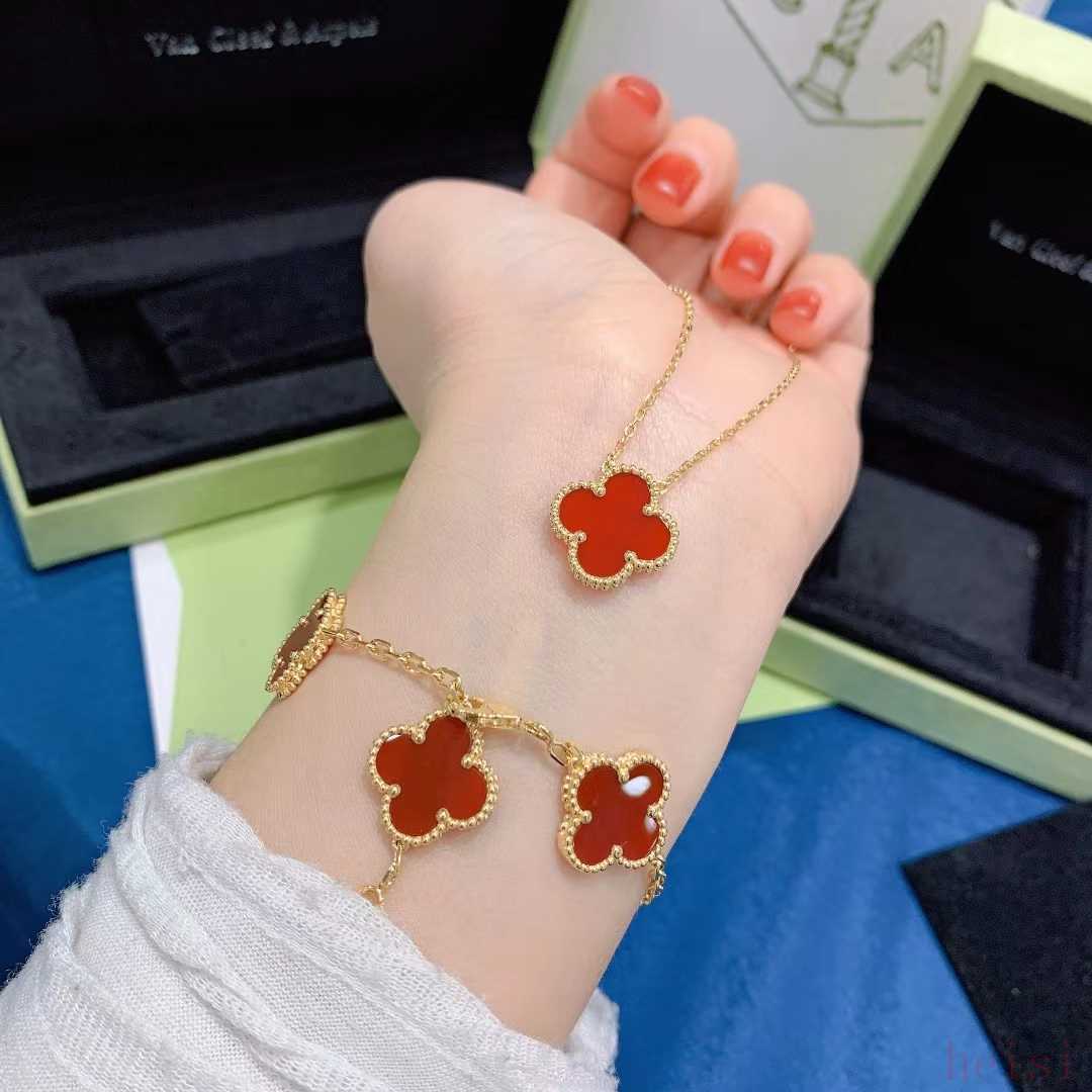 紅色四葉草:采用18K金鑲嵌紅瑪瑙,有四葉草項鏈、戒指、耳釘、手鏈全套的紅色首飾,也有可以適合北方佩戴的大號四葉草毛衣鏈。