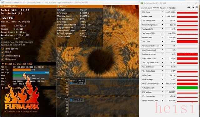 本次萬麗雪狐 GeForce RTX 5050 OC在半小時(shí)左右的烤機(jī)測(cè)試中GPU溫度為60℃;顯存溫度為52℃。即便在滿載烤機(jī)中,用手摸起來也只是溫?zé)岬某潭取A硗饪梢钥吹皆赥DP 100%的滿載情況下,整卡功耗為130W。