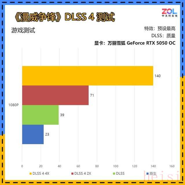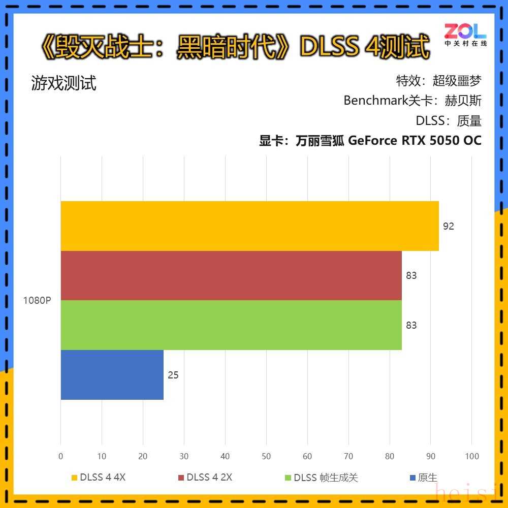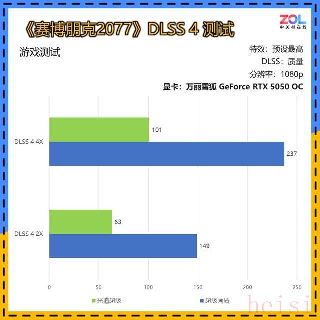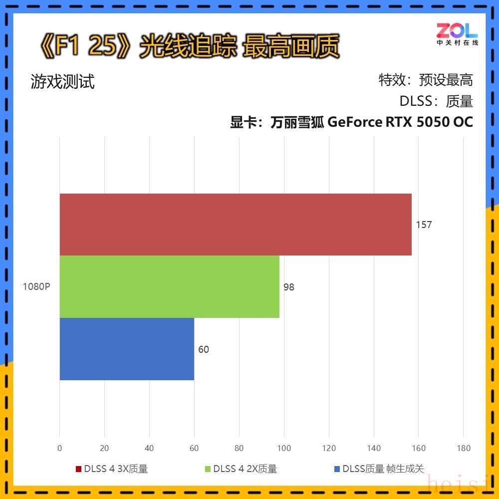 萬麗雪狐 GeForce RTX 5050 OC顯卡測(cè)試均開啟DLSS 4,但分為2X與4X,可以理解為DLSS 3時(shí)代的單幀生成與DLSS 4的多幀生成進(jìn)行對(duì)比。