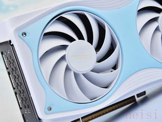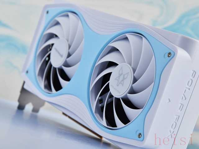 萬麗雪狐 GeForce RTX 5050 OC的2*90mm環(huán)形扇葉采用寬葉片設(shè)計(jì),提升風(fēng)量風(fēng)壓,風(fēng)流更集中,噪音更低。從單風(fēng)扇的角度來看,淡藍(lán)色的狐型面蓋頂端有類似于獸耳的形狀設(shè)計(jì),這讓原本較為突兀的面蓋螺絲位,也顯得更加合理,設(shè)計(jì)十分巧妙。