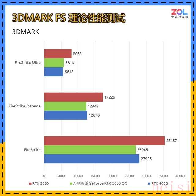 在針對(duì)顯卡DX11性能的3DMARK FS套裝測(cè)試中,萬麗雪狐 GeForce RTX 5050 OC相比RTX 5060的差距為24%/28%/28%,綜合約為27%。
