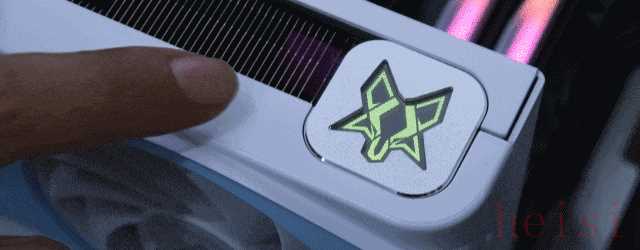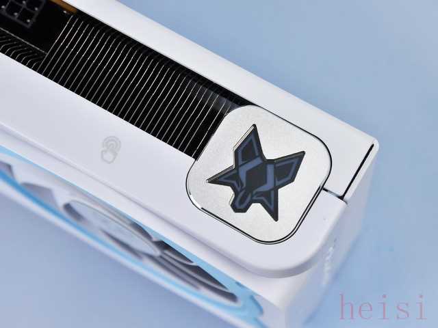 在顯卡側(cè)面,可以看到鑲嵌在合金銘牌中的雪狐系列l(wèi)ogo燈,左側(cè)還有觸控區(qū)域提示標(biāo)志。
