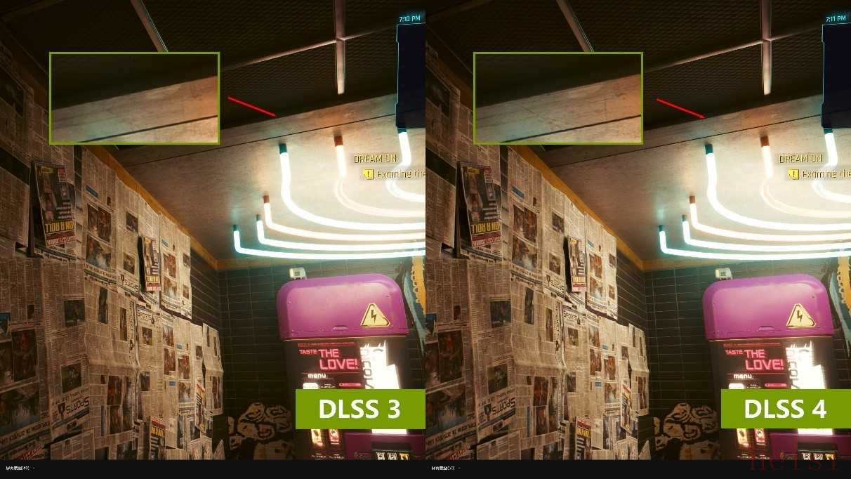 下面來看看使用CNN模型的DLSS 3與使用Transformer模型的DLSS 4在畫面上的對(duì)比。