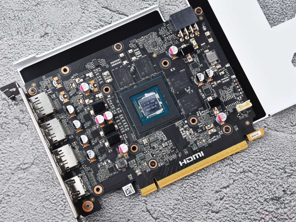 萬麗雪狐 GeForce RTX 5050 OC內(nèi)部排布也比較整潔,PCB中間為一顆采用TSMC 4N定制工藝的GB207-300-A1核心,圍繞核心的則是4顆2GB容量的GDDR6顯存,整卡采用3+2相供電。