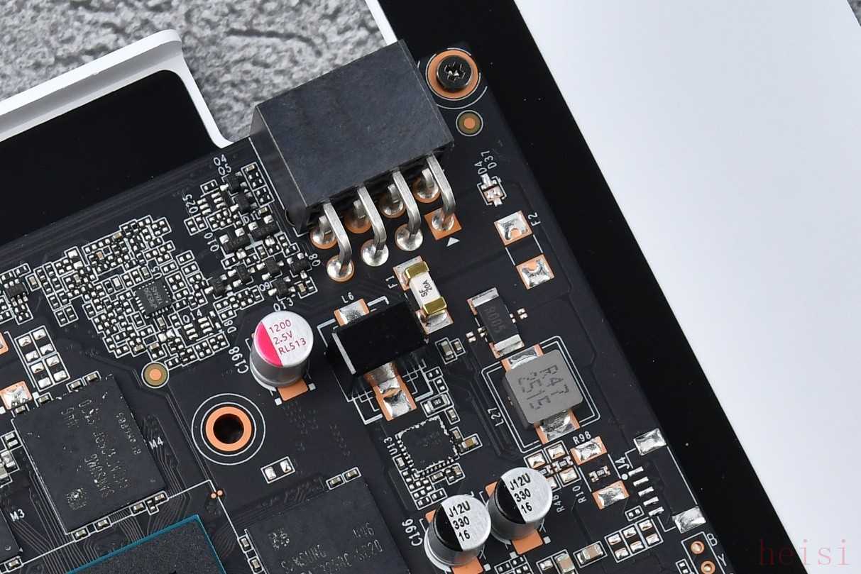 在顯卡PCB尾部,接近供電接口的位置,還有一個(gè)金色的獨(dú)立貼片熔斷保險(xiǎn),守護(hù)接口與核心安全,為高負(fù)載運(yùn)行,提供硬件級(jí)保護(hù)。