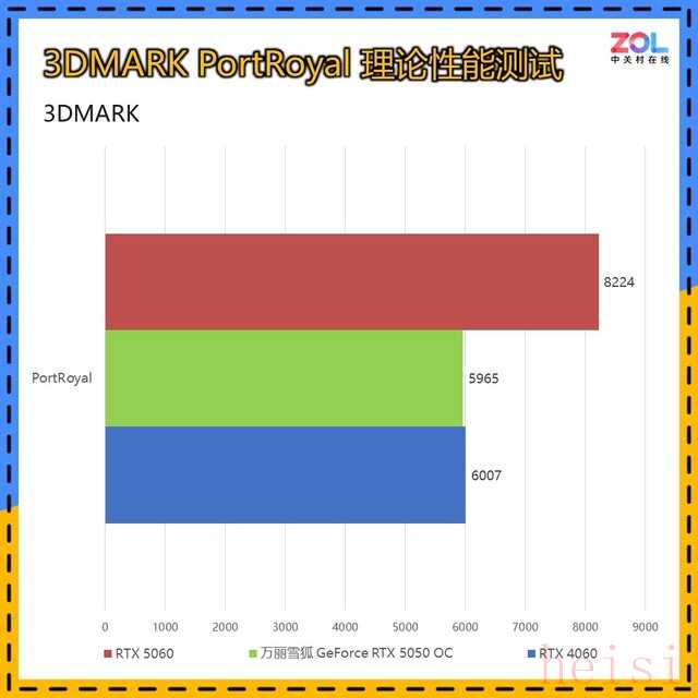 PortRoyal是3DMARK中專門針對(duì)光追性能的測(cè)試項(xiàng),萬麗雪狐 GeForce RTX 5050 OC相比RTX5060的差距為27%。