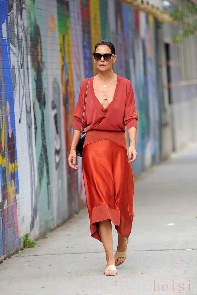 9月初剛有一絲秋意的紐約街頭,Katie Holmes穿著藍色牛仔褲,黑色露趾穆勒鞋,隨意將頭發(fā)束成一個松散的馬尾,戴著墨鏡,伸手試圖攔下一輛出租車帶她前往當天計劃的目的地。當一切看上去都再尋常不過時,Holmes放下手的瞬間,她身上奶茶色的Khaite最新款羊絨開衫順著她光滑的右肩掉落,露出里面同款面料的羊絨文胸,以及被曬得很均勻的小麥色肌膚。一切就開始產生了奇妙的化學變化。