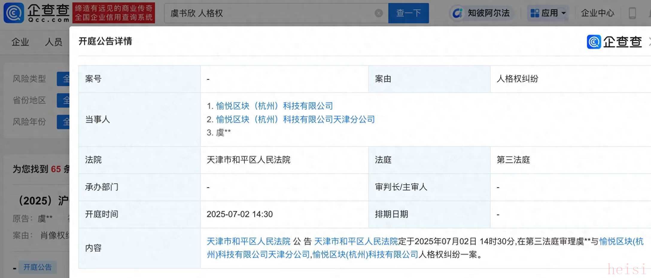 企查查APP顯示,近日,法院公開虞書欣與愉悅區(qū)塊(杭州)科技有限公司等人格權(quán)糾紛開庭公告信息,將于7月2日在天津市和平區(qū)人民法院開庭審理。