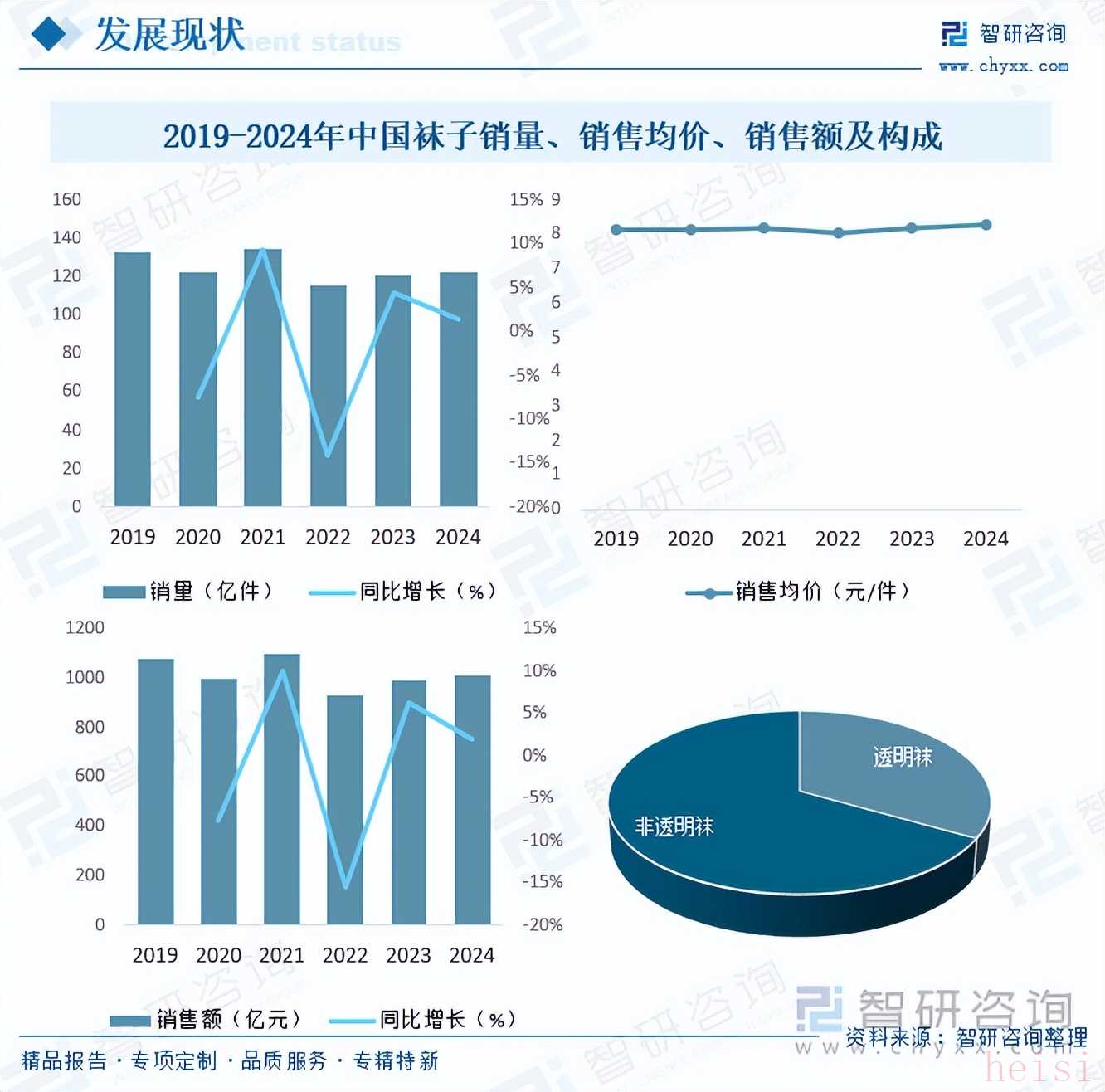 內(nèi)容概要:襪子是生活中人人需要,必不可少的服飾用品,是典型的快速消費(fèi)品,且襪子平均消費(fèi)單價(jià)相對于其他紡織服裝類商品來說要低很多,消費(fèi)水平完全是消費(fèi)者可以承擔(dān)的,因此,襪子市場是一個(gè)無比巨大的市場,據(jù)統(tǒng)計(jì),2024年我國襪子銷量122.29億件,銷售額達(dá)1010.74億元,其中,非透明襪占比超60%,未來,隨著國民生活水平提高和消費(fèi)觀念轉(zhuǎn)變,消費(fèi)者不再僅滿足于襪子的基本保暖功能,對舒適度、功能性(如抗菌、吸汗、防臭等)和時(shí)尚性的要求日益提高,個(gè)性化、定制化需求也在增長,為行業(yè)帶來更多細(xì)分市場機(jī)會(huì)。