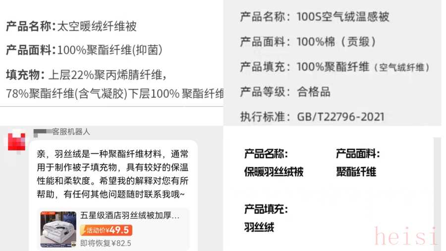 例如,記者在電商平臺上購買了一款“五星級酒店羽絲絨加厚保暖被”,10斤填充物售價才107元,實際體驗后發(fā)現(xiàn)保暖性不錯。不過,客服機(jī)器人承認(rèn),“羽絲絨”不是羽絨,而是聚酯纖維。