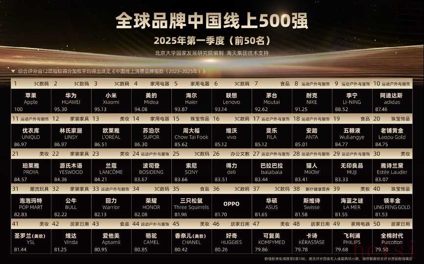 5月21日,北京大學(xué)國(guó)家發(fā)展研究院發(fā)布全球首個(gè)聚焦高質(zhì)量發(fā)展的系列消費(fèi)指數(shù)《中國(guó)線上消費(fèi)品牌指數(shù):2023-2025年》,研究團(tuán)隊(duì)基于淘寶天貓平臺(tái)真實(shí)的銷(xiāo)售、價(jià)格、搜索、好評(píng)等維度,對(duì)品牌質(zhì)量進(jìn)行綜合性評(píng)分,并制訂出全球首個(gè)完全基于消費(fèi)者實(shí)際購(gòu)買(mǎi)行為的品牌榜單“全球品牌中國(guó)線上500強(qiáng)”,最終蘋(píng)果、華為、小米分列榜單前三名,成為最受中國(guó)消費(fèi)者喜愛(ài)的消費(fèi)品牌。