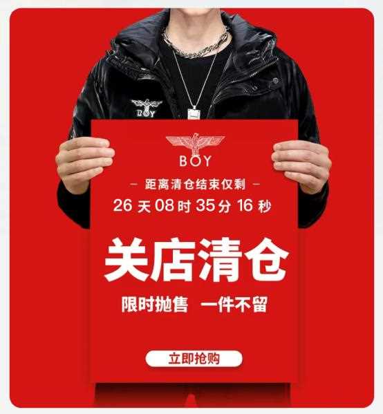 據(jù)了解,近期,BOY LONDON的天貓、京東官方店鋪均發(fā)布了關(guān)店清倉的消息,并表示“限時(shí)拋售、一件不留”。而根據(jù)淘寶旗艦店發(fā)布的倒計(jì)時(shí)圖顯示,網(wǎng)店預(yù)計(jì)在12月底正式關(guān)閉運(yùn)營。