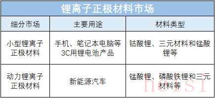 鋰電正極材料市場分為小型鋰電、動力鋰電正極材料兩種。小型鋰電正極材料主要用于手機、筆記本電腦等3C用鋰電池產(chǎn)品,包括鈷酸鋰、三元材料和錳酸鋰;動力鋰電正極材料主要為錳酸鋰、磷酸鐵鋰和三元材料。