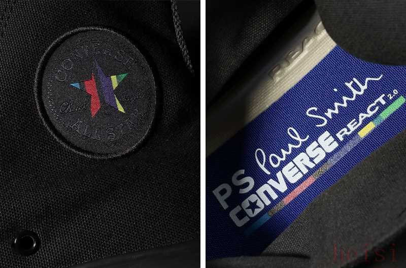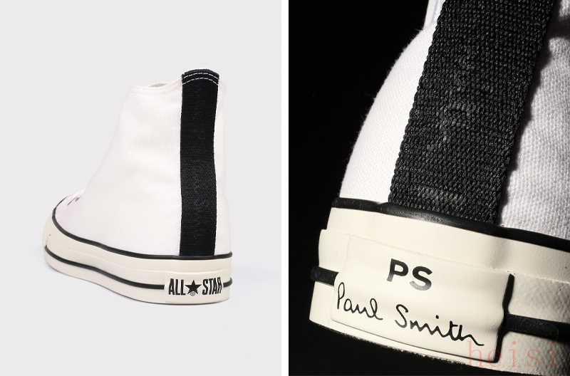 細(xì)節(jié)方面,鞋墊采用不對稱設(shè)計(jì),一側(cè)為紅色,一側(cè)為藍(lán)色,后跟的標(biāo)簽則分別裝飾了“All Star”以及“PS Paul Smith”字樣。另外,鞋帶頭也有彩色條紋裝飾。