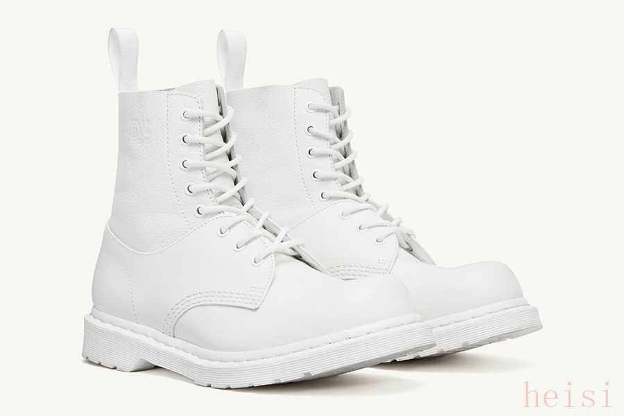 兩款鞋都采用了純白色調(diào),這呼應(yīng)了 MM6 Maison Margiela 去年米蘭時裝周期間帶來的 2025 春夏秀場的白色油漆元素,材質(zhì)上則都用了光滑皮革和弗吉尼亞皮革的組合,再搭配上同色縫線,八孔靴后端還有定制的白色 AirWair 拉環(huán)。
