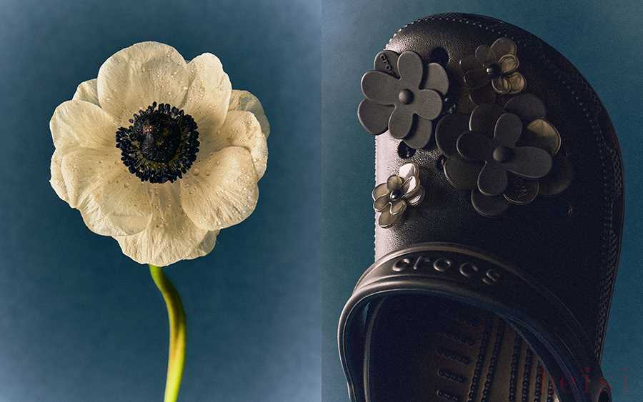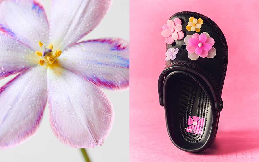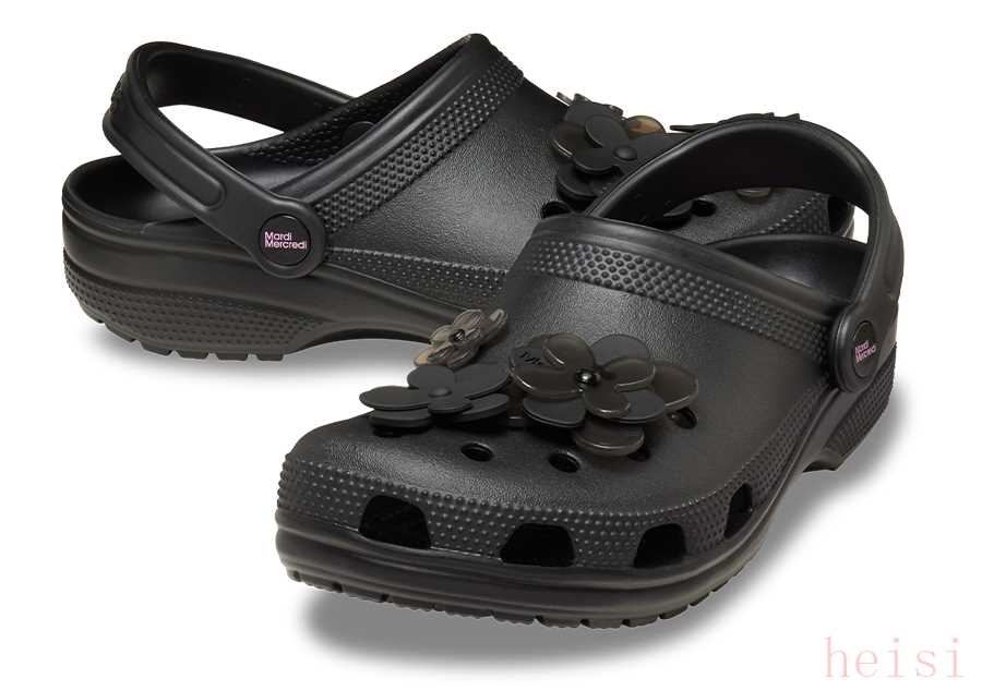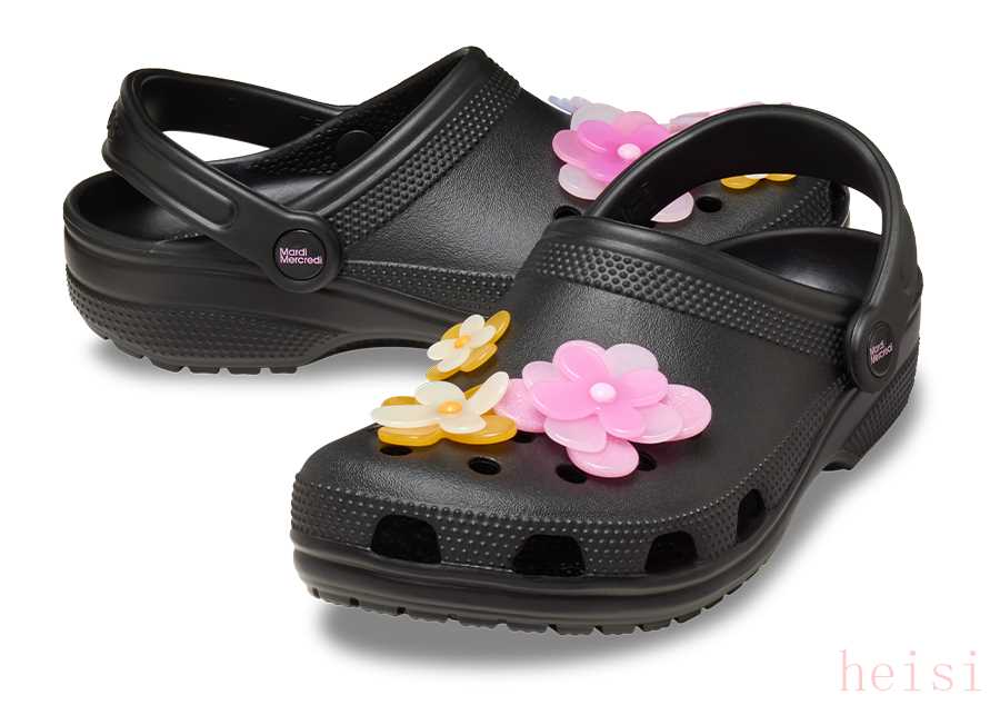 合作以經(jīng)典洞洞鞋為原型,同時主打 Mardi Mercredi 簽名式的花朵元素。系列共帶來了兩款配色,其中全黑款的鞋身和“智必星”鞋花都采用了啞光黑設(shè)計(jì),另一款鞋身是黑色調(diào),同時搭配了粉黃撞色花卉的鞋花。當(dāng)然鞋花都是可自由拆裝的,搭配上有一定的 DIY 空間。