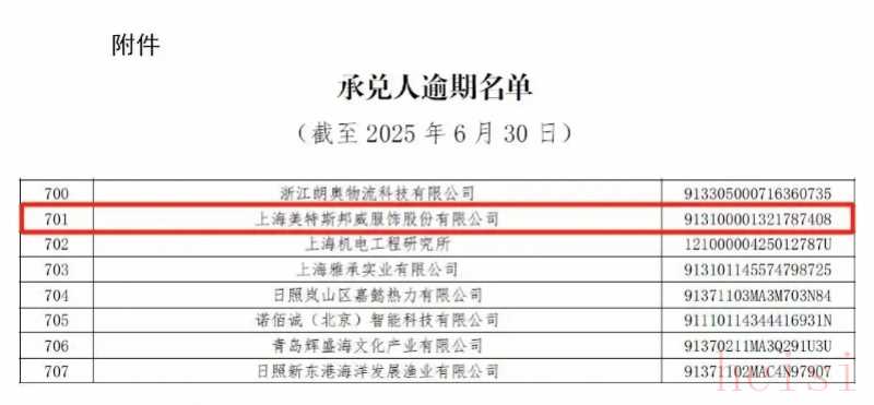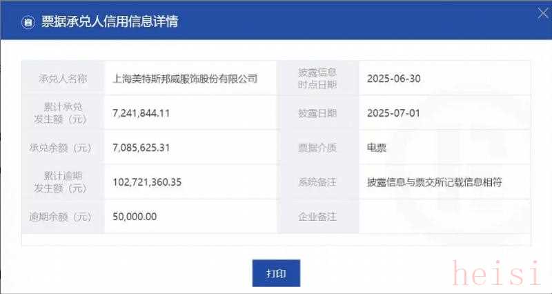 同時(shí),上海票據(jù)交易所近日披露的承兌人逾期名單中亦出現(xiàn)了美邦服飾。名單顯示,2025年上半年,有889家承兌人多次出現(xiàn)票據(jù)逾期行為,其中美邦服飾在2025年上半年累計(jì)承兌發(fā)生額達(dá)724萬元,承兌余額為708萬元,而累計(jì)逾期發(fā)生額卻高達(dá)1.03億元。承兌人逾期有明確界定:承兌人在6個(gè)月內(nèi)發(fā)生3次以上票據(jù)逾期且月末存在逾期余額,或者當(dāng)月出現(xiàn)票據(jù)逾期行為,即被視為承兌人逾期。