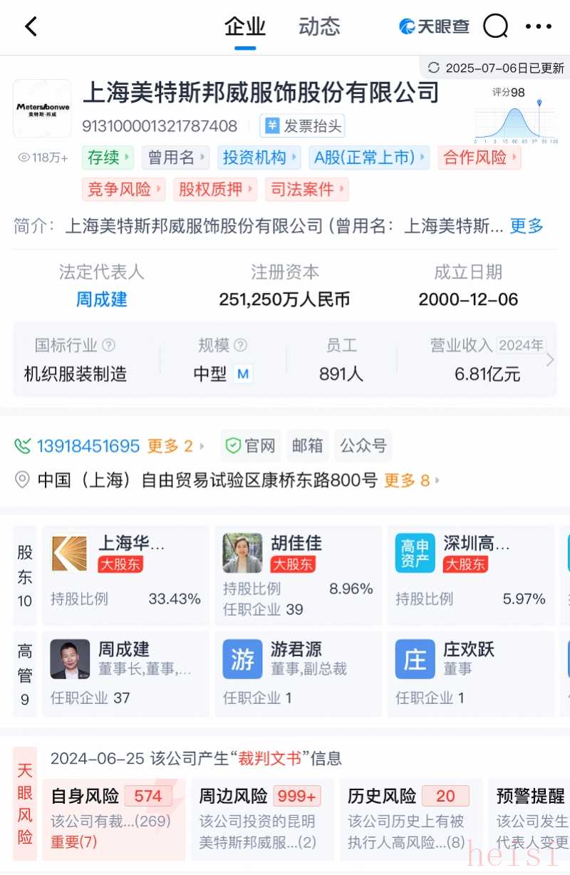天眼查顯示,上海美特斯邦威服飾股份有限公司成立于2000年12月6日,注冊(cè)資本25億元,員工近900人。大股東為上海華服投資有限公司,持股比例為33.43%。2025年6月25日該公司因合伙企業(yè)糾紛成為被執(zhí)行人,被執(zhí)行總金額7.97億元,執(zhí)行法院為上海市第一中級(jí)人民法院。該公司的實(shí)控人就是美特斯邦威的創(chuàng)始人周成建,其曾于2009年、2010年兩次登上中國(guó)內(nèi)地服裝業(yè)首富。美邦服飾的二股東為周成建的女兒胡佳佳,持股比例為8.96%。資料顯示,胡佳佳1986年出生,2016年接班擔(dān)任美邦服飾的董事長(zhǎng)、總裁。但據(jù)悉自2024年起,胡佳佳已卸任,周成建重新掌舵,被業(yè)內(nèi)稱為“反向接班”。