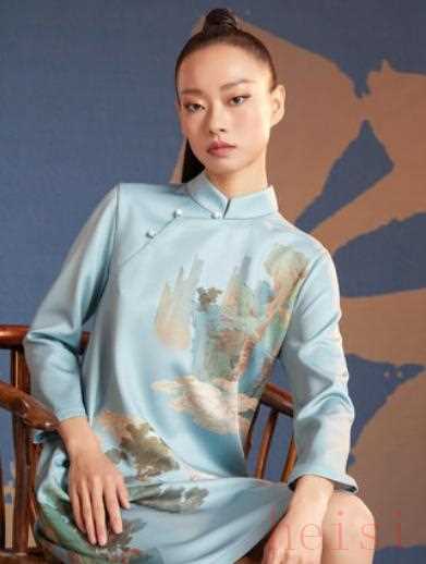 以衣身為畫布,描繪了一副“采菊東籬下,悠然見南山”的景象,簡潔圓領(lǐng)盡顯大方姿態(tài),斜開口處用圓形紐扣固定,立顯女神的高冷感。