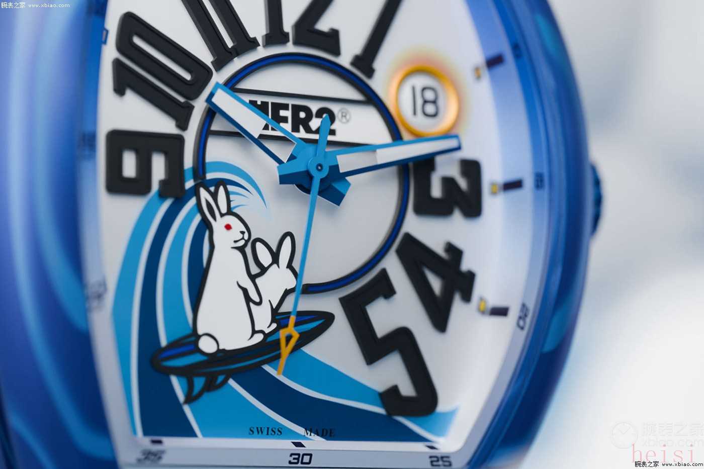 盤(pán)面6時(shí)至8時(shí)位置浮雕經(jīng)典兔子標(biāo)識(shí),或曬太陽(yáng)、或沖浪、或在椰樹(shù)下嬉戲,格外契合夏季海濱度假主題。此外,日期視窗巧妙地從6時(shí)位置移動(dòng)到2時(shí)位置,圓形邊框經(jīng)過(guò)鍍金處理,以象征太陽(yáng)。中央指針配色與表殼相稱(chēng),結(jié)合亮黑色PVD鑲貼阿拉伯?dāng)?shù)字時(shí)標(biāo),呈現(xiàn)非常立體的視覺(jué)效果。