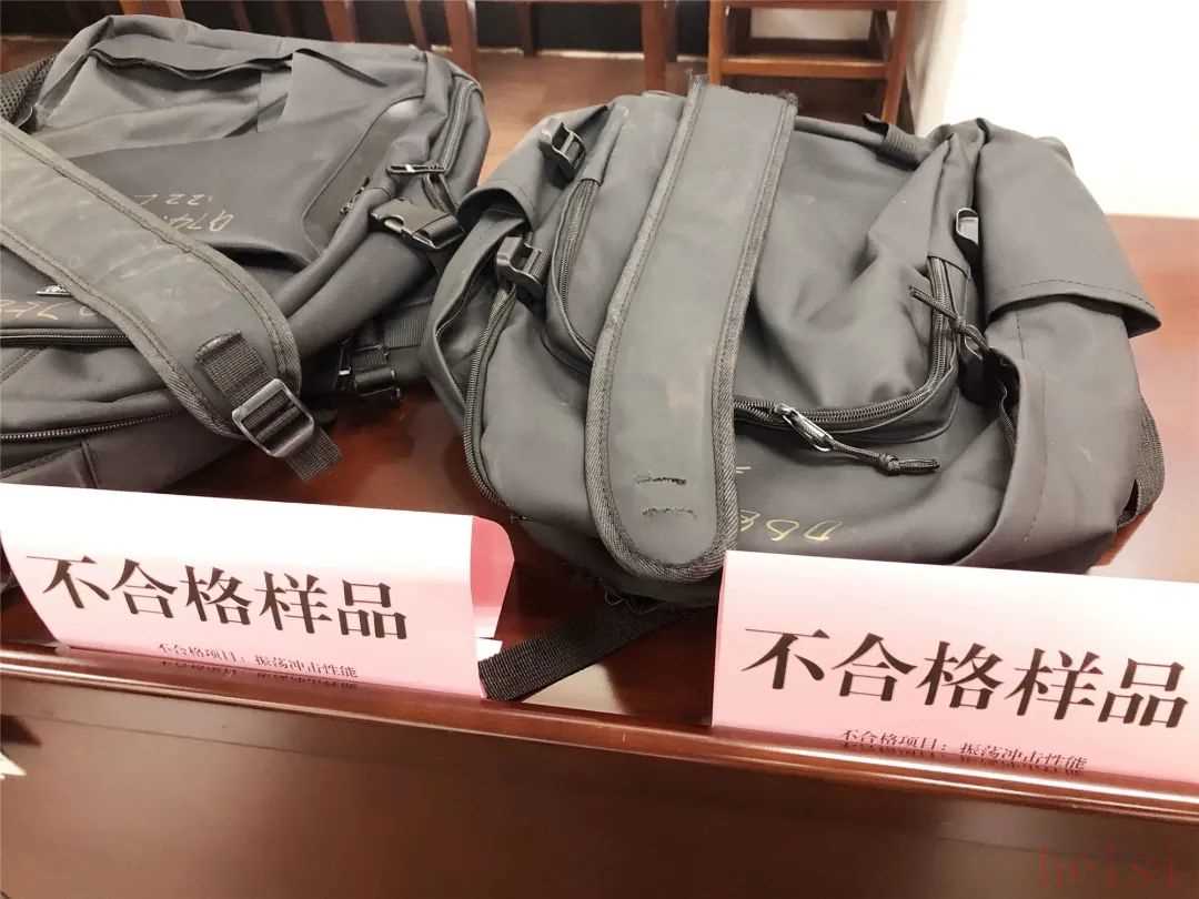 不合格項目:振蕩沖擊性能,經(jīng)測試,背帶、包體存在開線、斷裂情況。