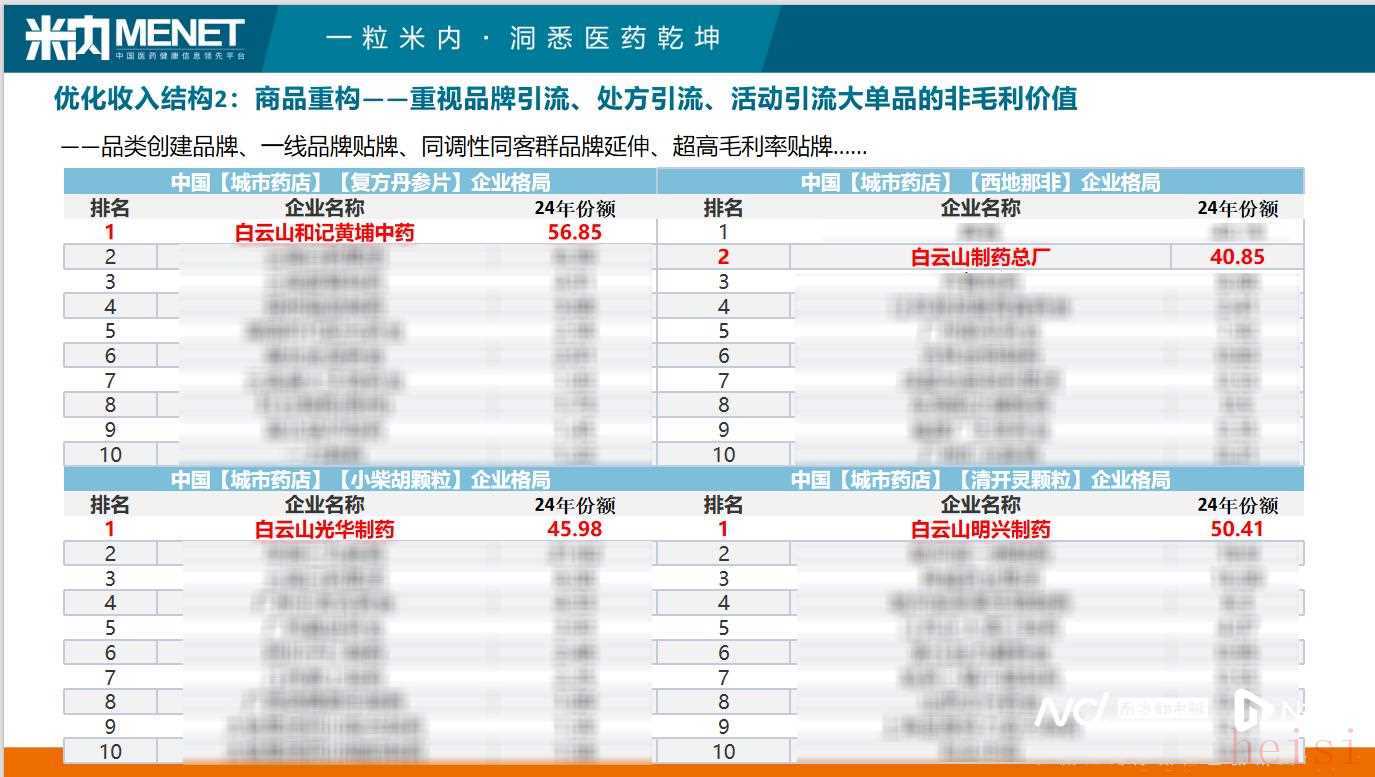 米內(nèi)網(wǎng)相關(guān)數(shù)據(jù)顯示:2024年,在中國城市藥店的企業(yè)格局排行榜當(dāng)中,在西地那非領(lǐng)域,金戈位列國內(nèi)藥企第一,在小柴胡領(lǐng)域,白云山小柴胡顆粒位列第一,在清開靈領(lǐng)域,白云山清開靈顆粒位列第一。