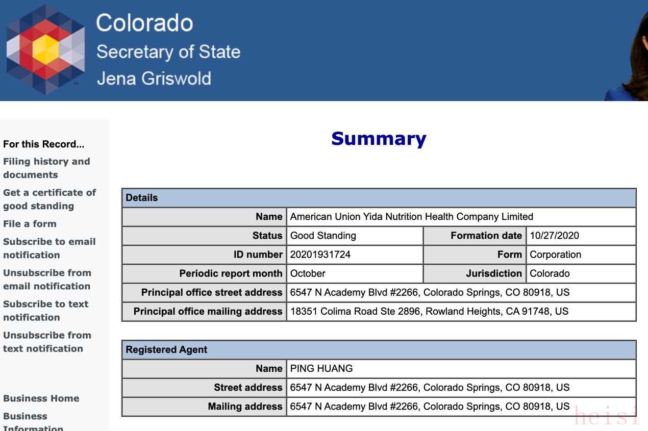 記者在多個(gè)搜索引擎平臺(tái)、全球購(gòu)物網(wǎng)站上沒有找到上述產(chǎn)品,關(guān)于Unionyidahealth的信息鮮少。其官網(wǎng)的產(chǎn)品頁(yè)面上,展示了該公司旗下其他品牌的幾款天然營(yíng)養(yǎng)補(bǔ)充劑產(chǎn)品,但沒有上述產(chǎn)品。官網(wǎng)上也沒有任何有關(guān)該公司、生產(chǎn)工廠的資料介紹和實(shí)景照片。記者注意到,該公司注冊(cè)地為科羅拉多州。負(fù)責(zé)監(jiān)管州內(nèi)注冊(cè)公司的科羅拉多州州務(wù)卿辦公室網(wǎng)站顯示,該公司成立于2020年10月,公司注冊(cè)人名為“HUANG PING”。