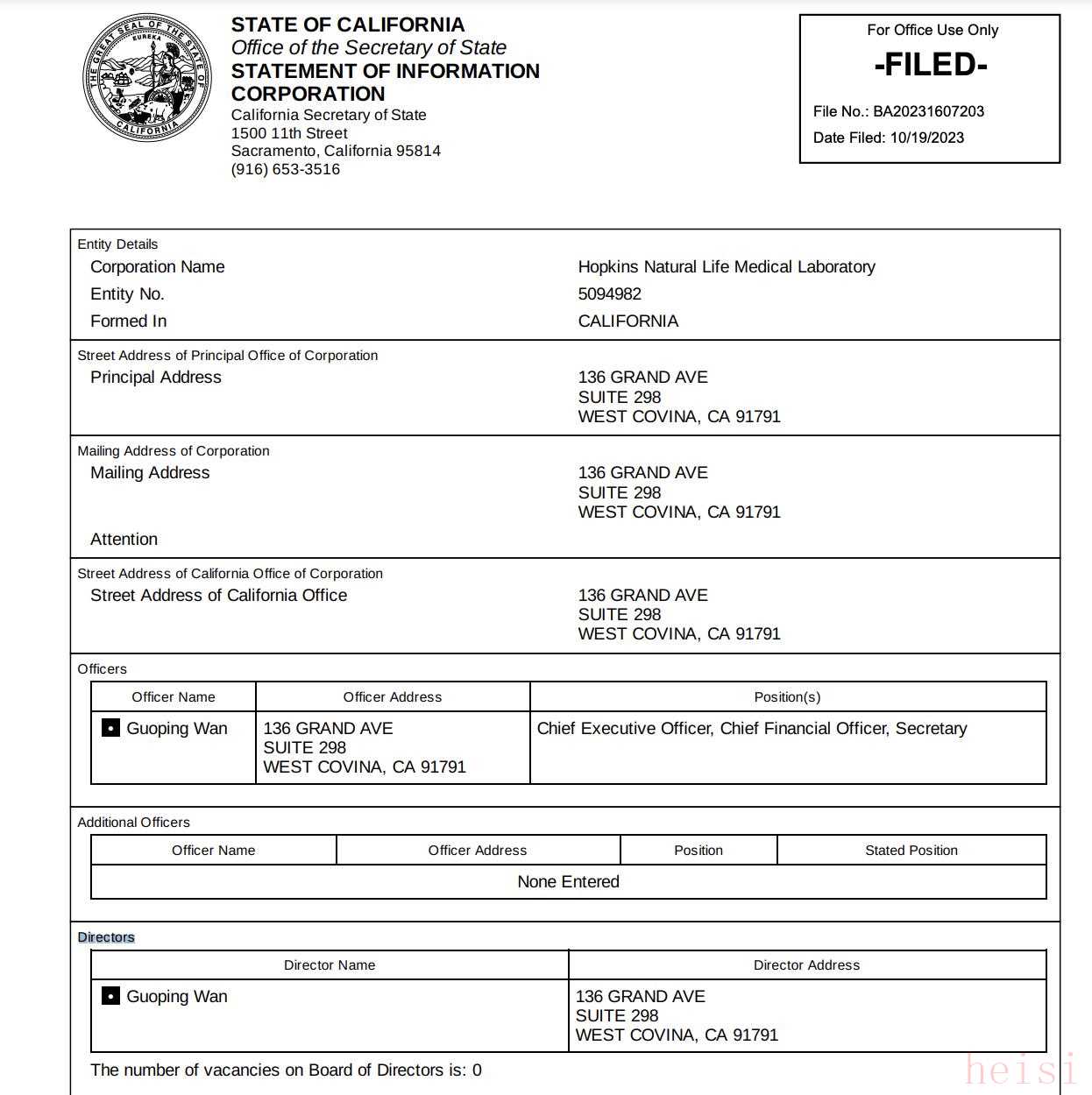 霍普金斯自然生命醫(yī)學(xué)實(shí)驗(yàn)室2023年10月的公司信息存檔記錄,截自加利福尼亞州州務(wù)卿辦公室網(wǎng)站