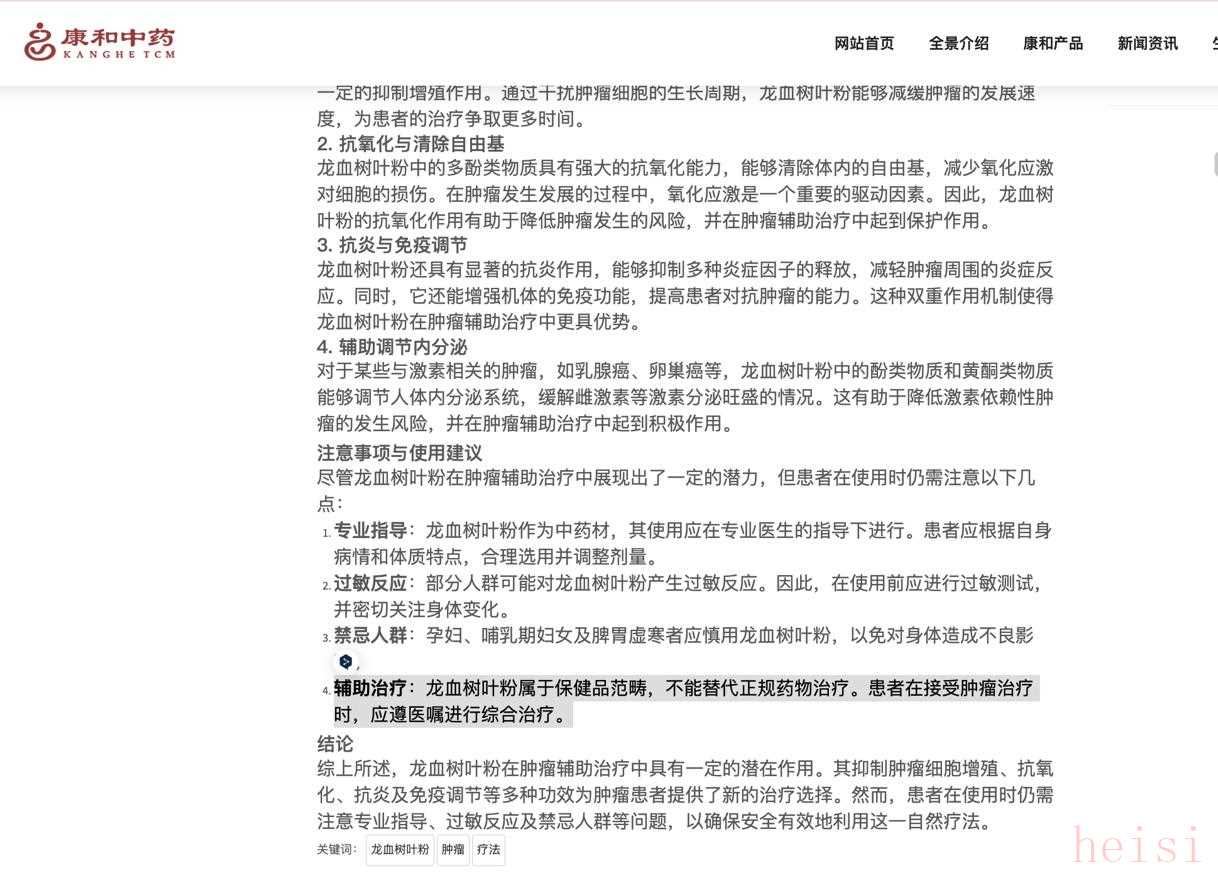 “龍血樹葉粉“對(duì)腫瘤有潛在輔助作用的文章,截自“康和中藥”官網(wǎng)