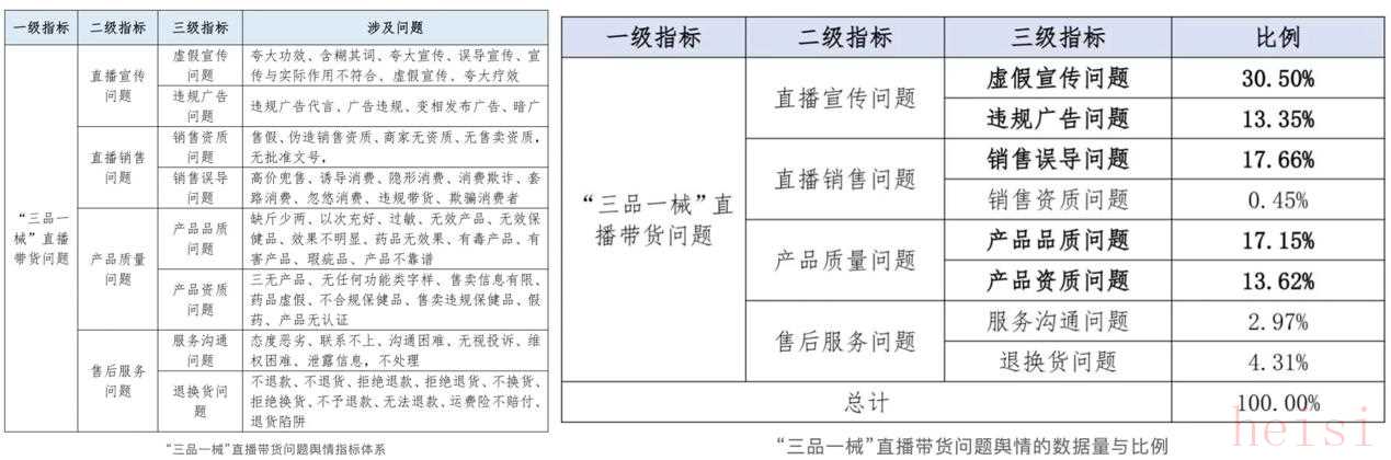 2024年10月15日,北京陽(yáng)光消費(fèi)大數(shù)據(jù)研究院、北京市食品藥品安全法治研究會(huì)等聯(lián)合發(fā)布《“三品一械”直播帶貨消費(fèi)調(diào)查報(bào)告》(以下簡(jiǎn)稱《報(bào)告》),共采集了2023年8月至2024年8月有關(guān)“三品一械”直播帶貨消費(fèi)輿情資訊共26542條,涉及輿情最多的為“藥品”(45.94%),其次為“保健食品”(34.01%)。 “直播宣傳”問題輿情相對(duì)比較突出,尤其是食品冒充保健品或藥品違規(guī)宣傳功效等問題比較普遍。其中,“虛假宣傳”問題輿情數(shù)據(jù)高達(dá)30.50%,“在所有問題中最為突出”。