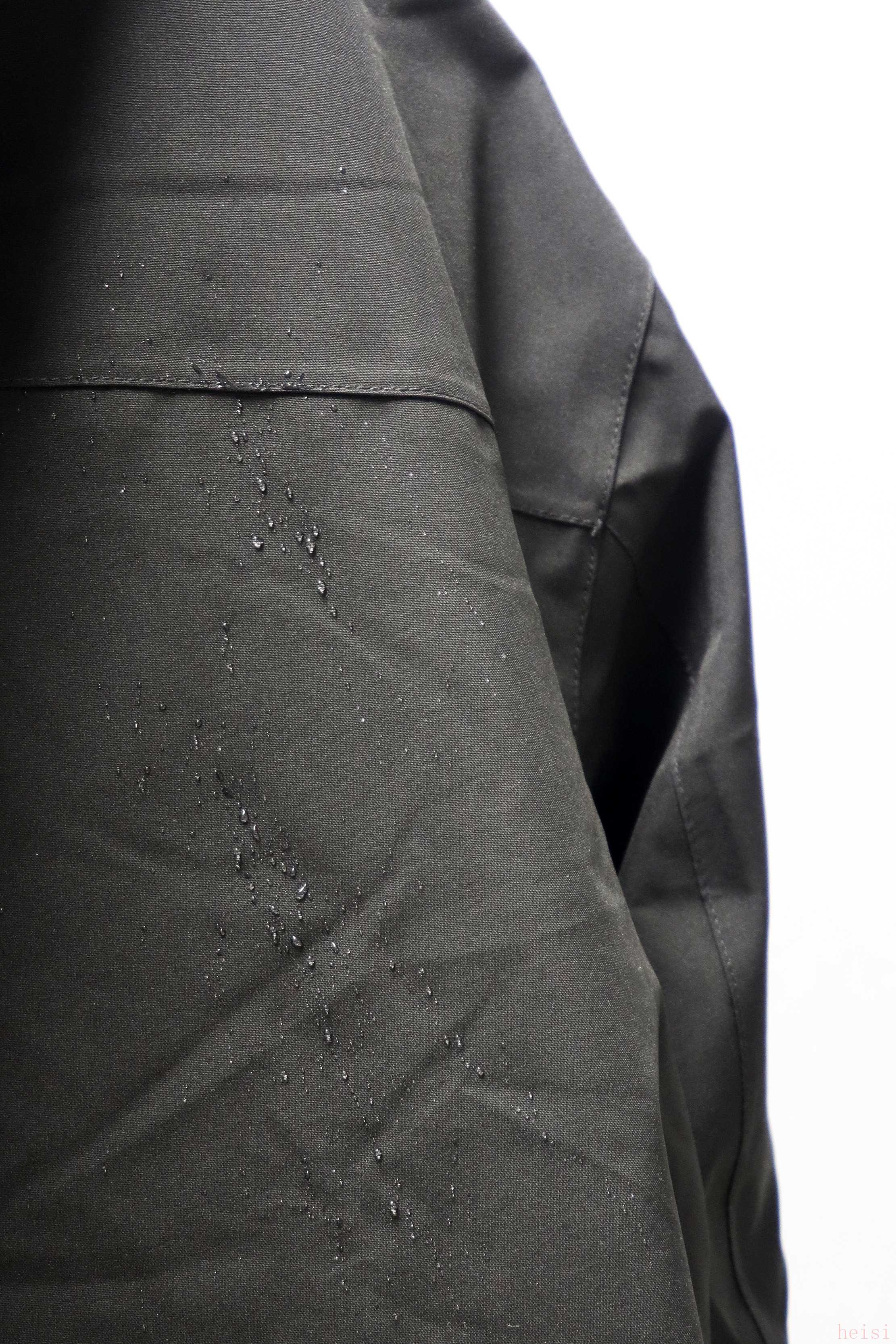 接下來筆者通過幾個(gè)小測試對GaKior戶外沖鋒衣的性能進(jìn)行評估,首先戶外防水效果。因?yàn)椴捎萌p隙EP無滲透雙層壓膠,且在此基礎(chǔ)上采用昂貴的高壓沖膠工藝,GaKior戶外沖鋒衣會(huì)有不錯(cuò)的防水性能表現(xiàn),常見小于小雪完全能夠應(yīng)付,如同荷葉般的隔離水珠。