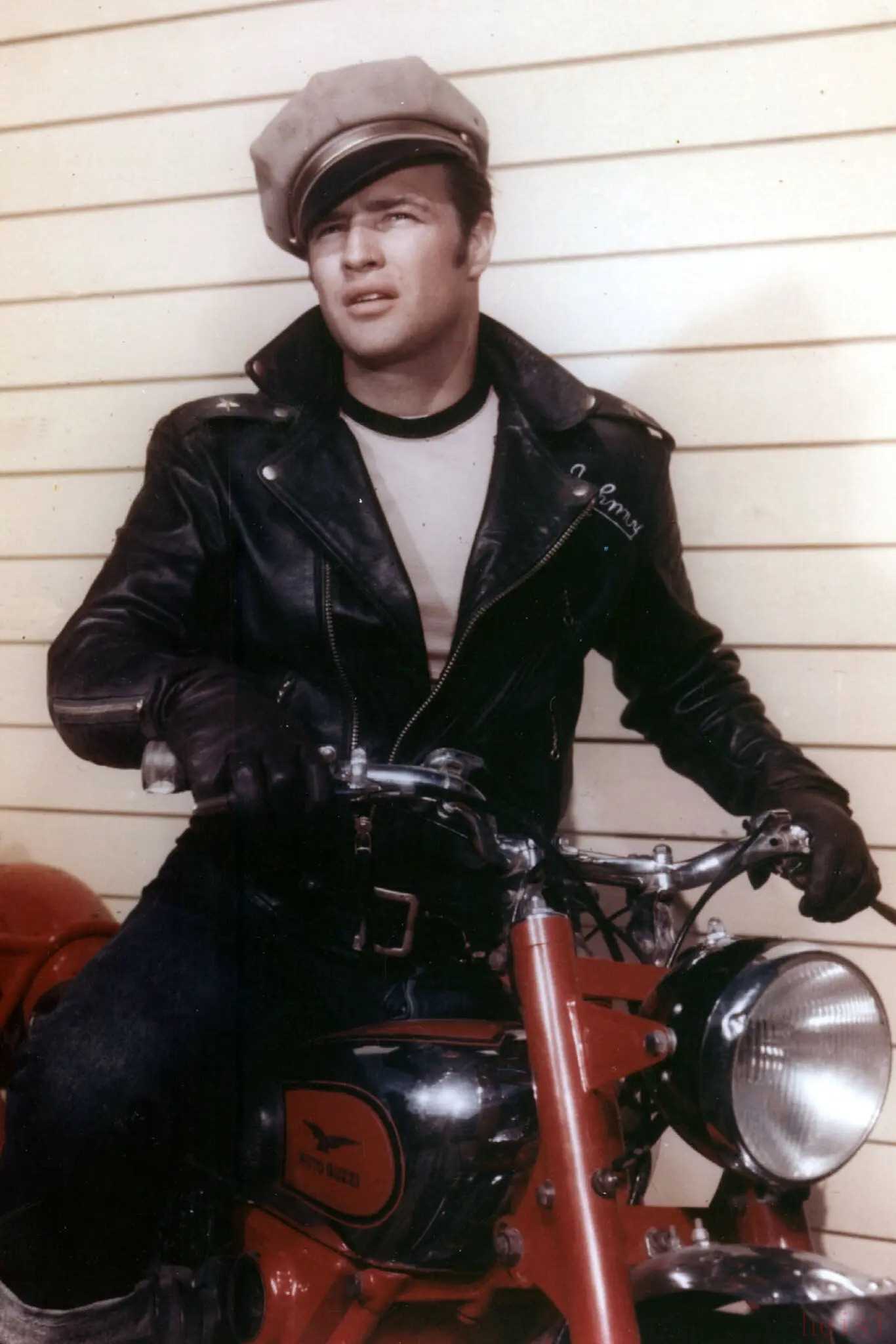 馬龍·白蘭度穿黑色皮夾克騎摩托車。