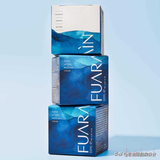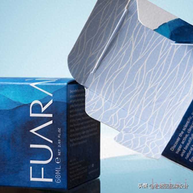 FUARAIN護膚品包裝設計FUARAIN護膚品包裝設計獨具巧思,以藍色為主色調,營造出清新、自然且專業(yè)的氛圍 。外盒圖案深淺不一的藍色猶如水墨,似山巒一樣的寧靜,視覺層次豐富,好像天然紋理一樣。整體設計在簡約中盡顯精致,也呼應了品牌源于自然、科學融合自然的特質。