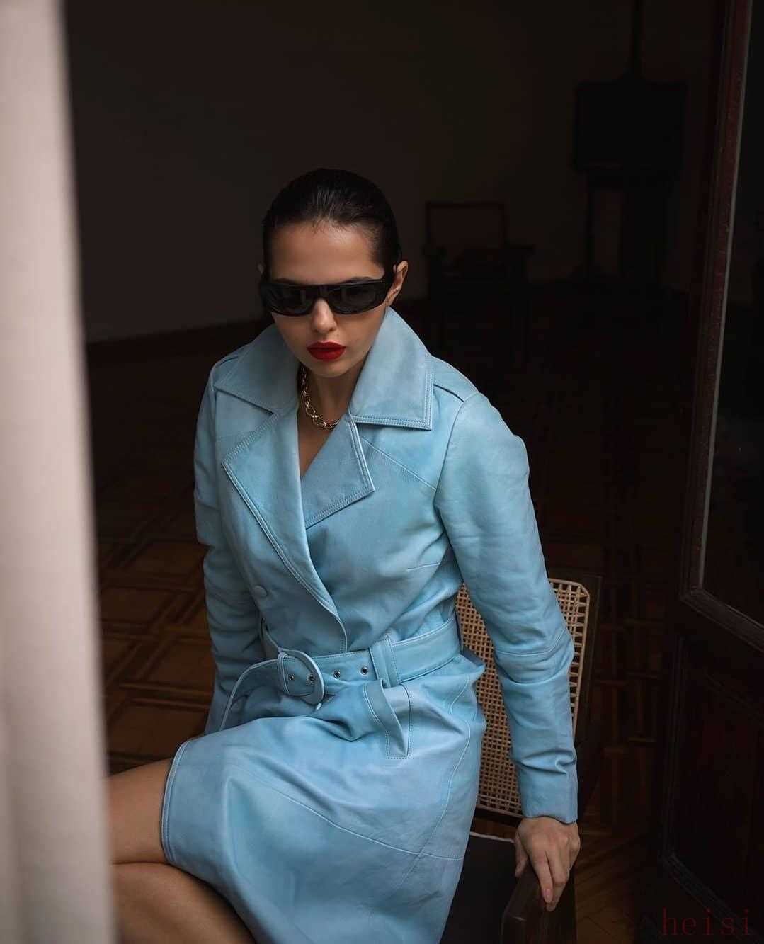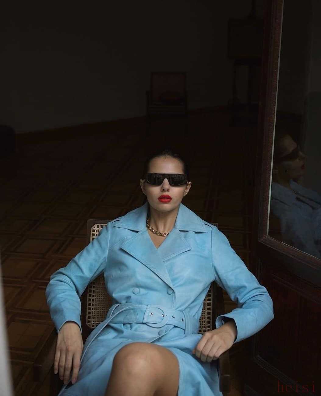 天藍的配色,帶給大家耳目一新的視覺沖擊力,還可以用紅唇和墨鏡為大衣加成,氣場兩米不是問題,時尚博主Doina也太會了!