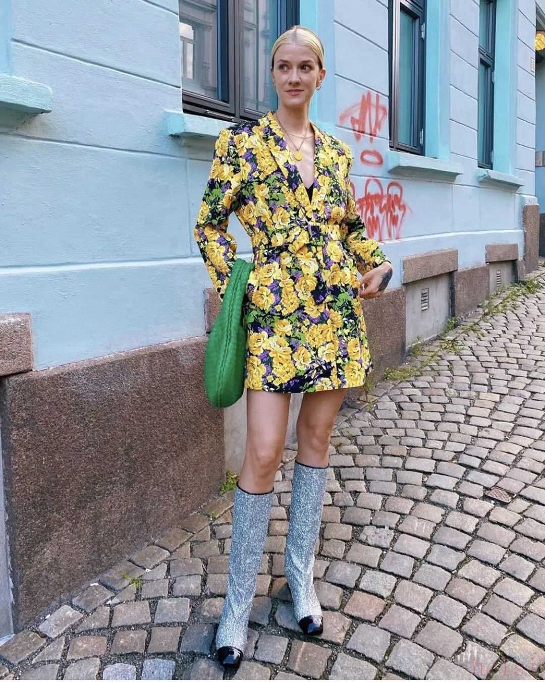 或者是學習博主Marianne的穿法,用印花長靴搭配,表現(xiàn)同樣可圈可點。