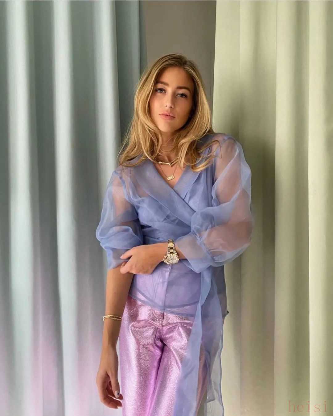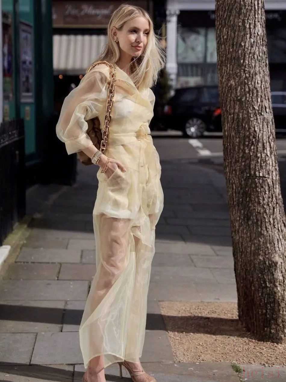 結(jié)合光澤的薄紗和PVC,營造柔和的暈染染色,硬紗質(zhì)地輕盈卻有著一定的硬挺度,上身更加挺闊有型,時裝博主emilisindlev用它和一條緞面長褲搭配,玩轉(zhuǎn)混搭,將女人味盡顯。