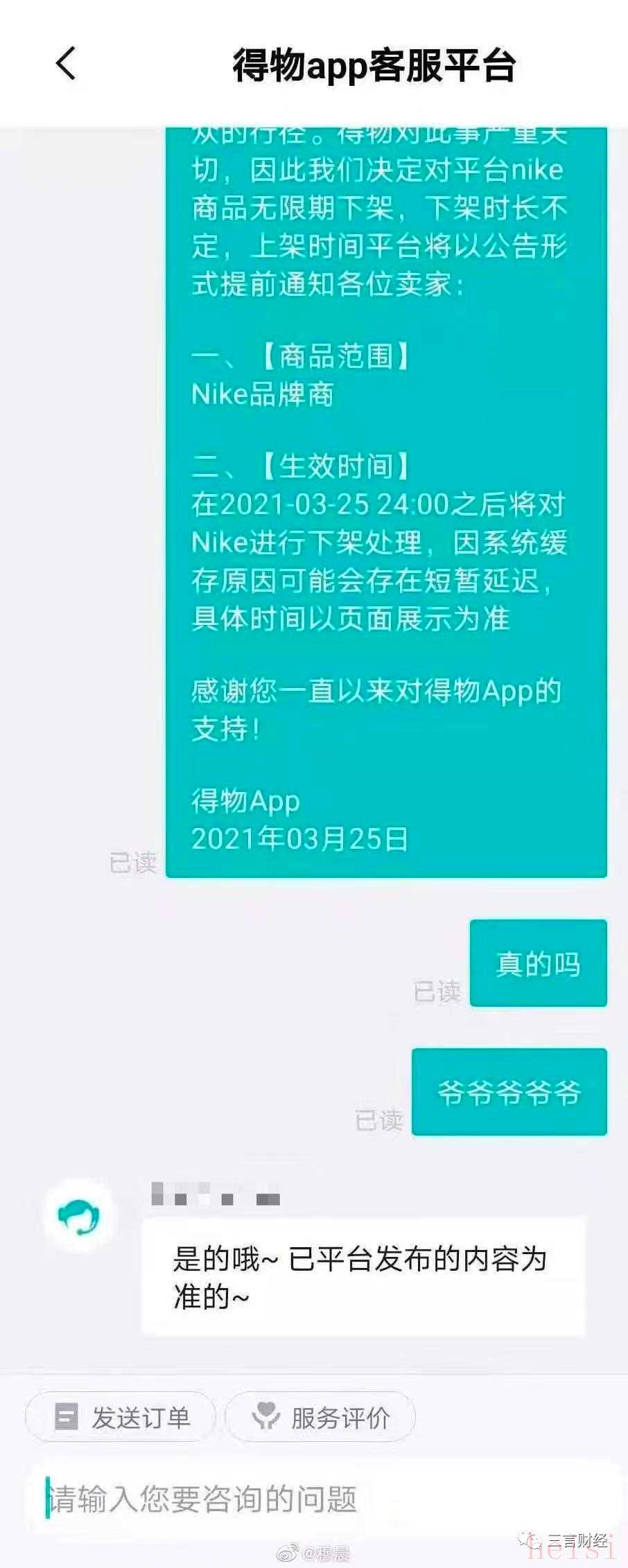 三言財(cái)經(jīng)3月26日消息,昨日有傳聞稱得物App將無限期下架耐克產(chǎn)品,有網(wǎng)友貼出了疑似平臺(tái)發(fā)給賣家的“下架通知”,但是也有網(wǎng)友從客服那里得到了否定的答案。此外,同樣經(jīng)營鞋類產(chǎn)品的nice昨日也發(fā)聲明,宣布全力支持新疆。
