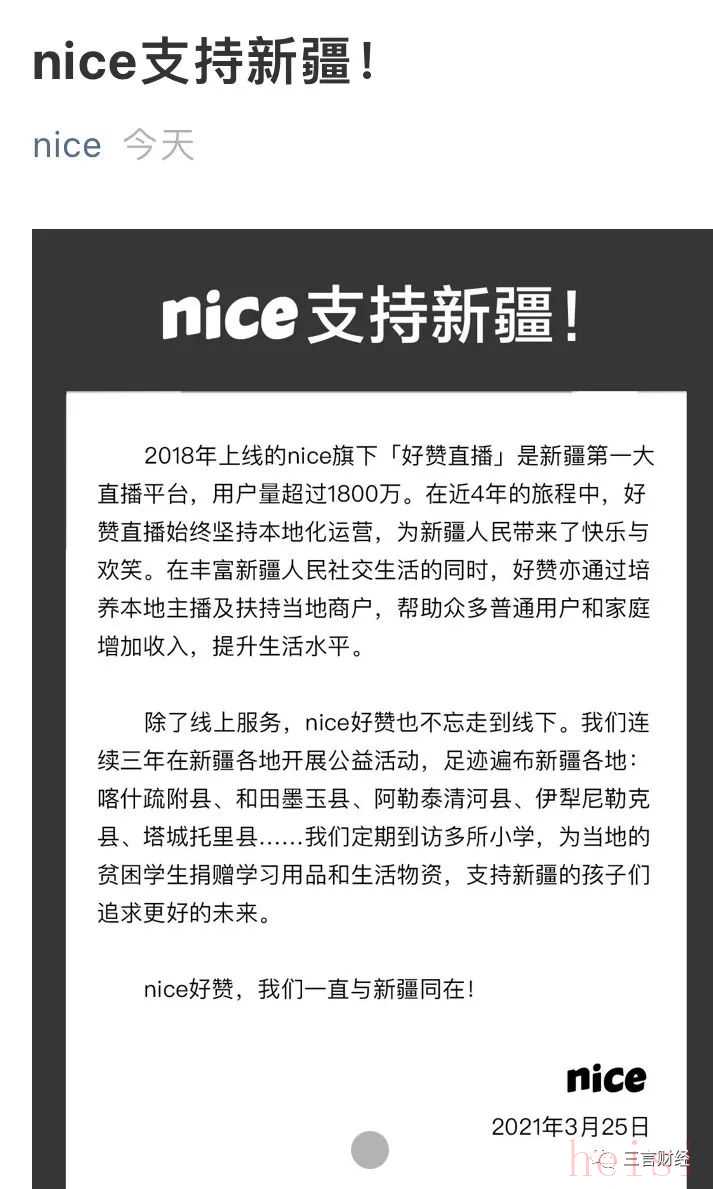 昨日,nice發(fā)文稱公司全力支持新疆。文章稱,nice旗下“好贊直播”是新疆第一大直播平臺(tái),用戶量超1800萬。四年間nice好贊一直堅(jiān)持本地化運(yùn)營,無論線上還是線下均堅(jiān)持為新疆發(fā)展出力。
