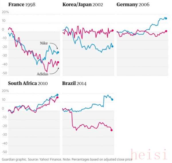 雅虎財經的數據顯示,除了2002年世界杯之外,其余四屆賽事結束三個月后,耐克的股價走勢更好。即使四年前巴西世界杯的兩支決賽隊伍均由阿迪達斯贊助,耐克的股價走勢超出阿迪三成。