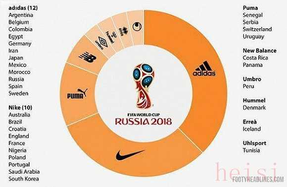 進入決賽圈的32個國家隊球衣,總共由8家不同的運動品牌贊助。其中,阿迪達斯拿下12支球隊的球衣贊助合同,除了球隊數量超過總額的三分之一,其贊助的德國、阿根廷和西班牙都是奪冠熱門,東道主俄羅斯亦在阿迪達斯的陣容之下。
