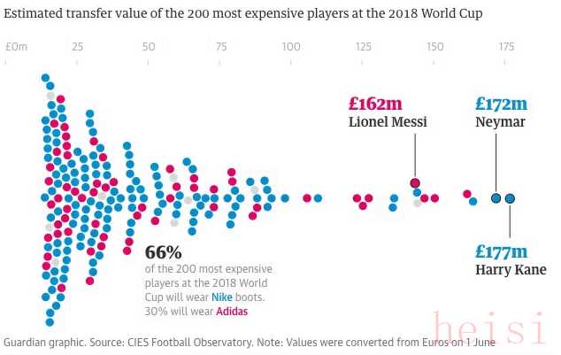 據《衛(wèi)報》的統計數據,本屆世界杯,身價最高的200名球星里,有132名球員選擇耐克的球鞋,比例高達66%。而穿著阿迪達斯球鞋的球員僅為59人,占據33%。如此看來,這一局的勝利落在耐克身上。